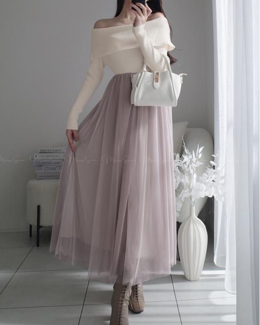 🇯🇵 JAPAN ♥ 氣質露肩針織薄紗喇叭連身裙 SS-JGOP744
